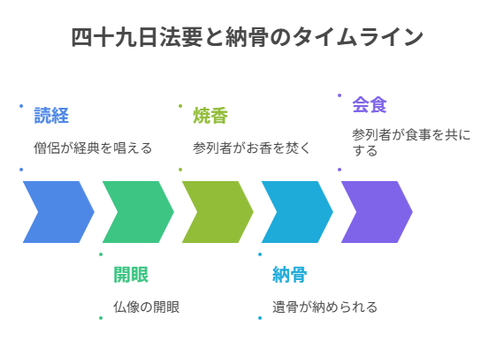 四十九日法要と同日に行う場合、次のような流れが一般的です。